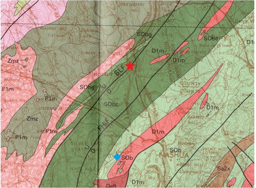 Audley Quarry Geology The Audly quarry (red star) is within the Berwick formation, a phyllite rock unit, green in this section of the 1997 NH bedrock geology map. |