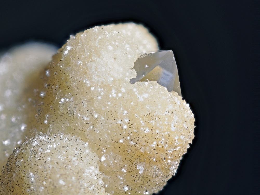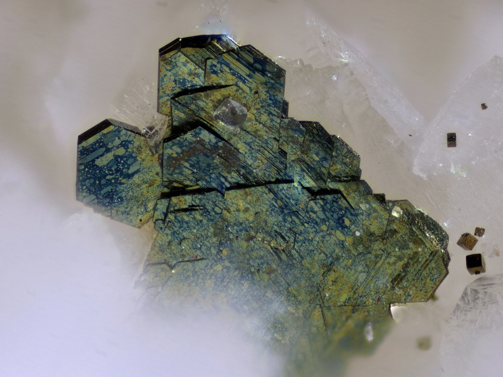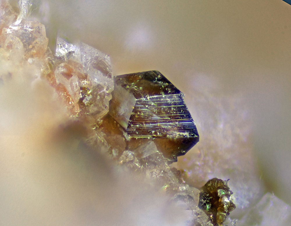 Species: BROOKITE Locality: Audley Quarry, Merrimack, NH Specimen Size: About a 0.1 mm brookite crystal Field Collected: Tom Mortimer 2019 Catalog No.: u2243 Notes: There are several tiny brookite crystals on this specimen. Some are a bit larger, but this one has terminated edges all around. This photo is at the highest magnification of my equipment. The photo shows details I cannot see with my Meiji stereo scope. |