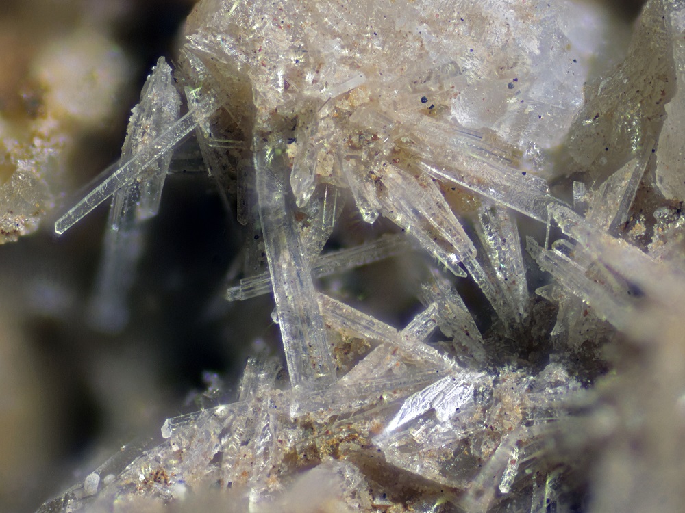 Species: ARAGONITE Locality: Audley Quarry Merrimack, NH Specimen Size: 6 mm field of view Field Collected: Tom Mortimer Catalog No.: Notes: Tiny aragonite crystals enclosing a quartz crystal. |