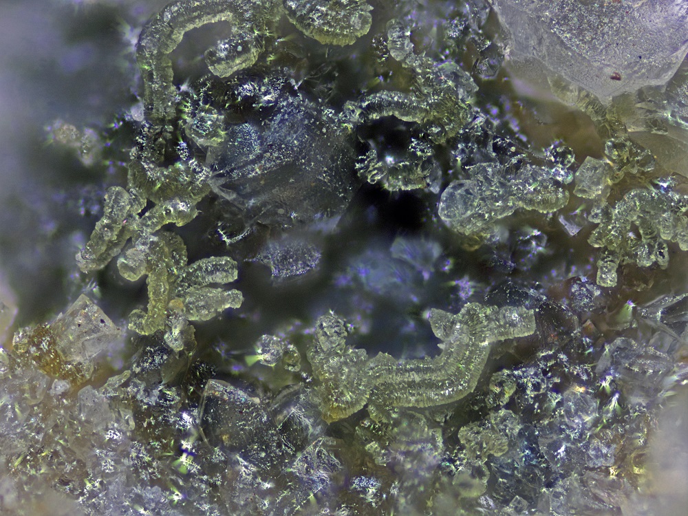 Species: CHLORITE Group (Vermiform – worms) Locality: Audley Quarry, Merrimack, NH Specimen Size: 1.3 mm field of view. Field Collected: Tom Mortimer Catalog No.: u2054 Notes: |