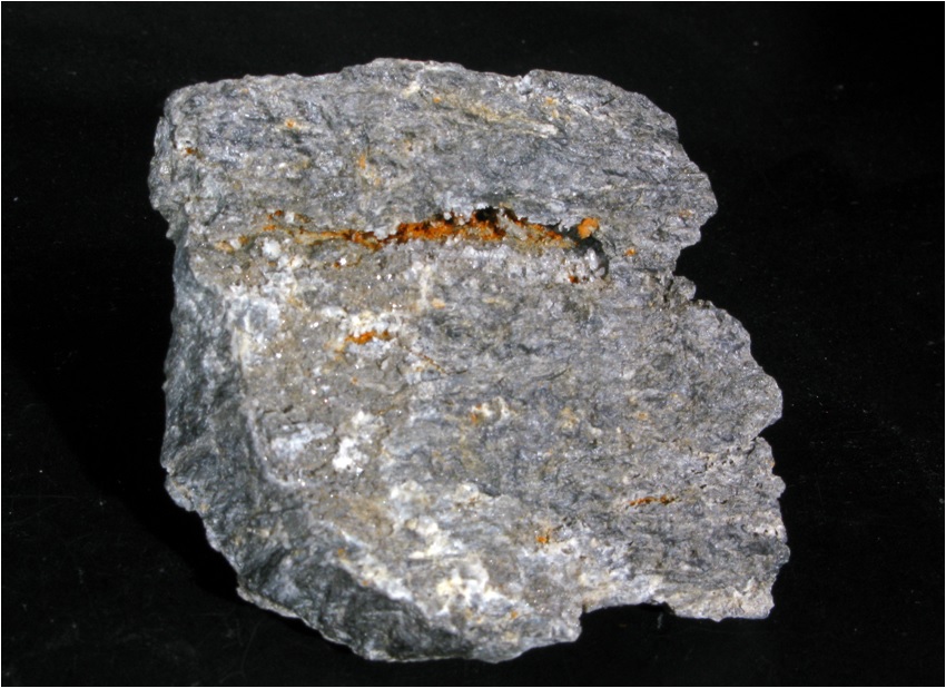 Species: Audley Quarry phyllite rock Locality: Audley Quarry, Merrimack, NH Specimen Size: 5 cm specimen Field Collected: Tom Mortimer Catalog No.: NC Notes: The Audley Quarry phyllite rock has thin seams with quartz and adularia. These seams host many interesting micro mineral species. |