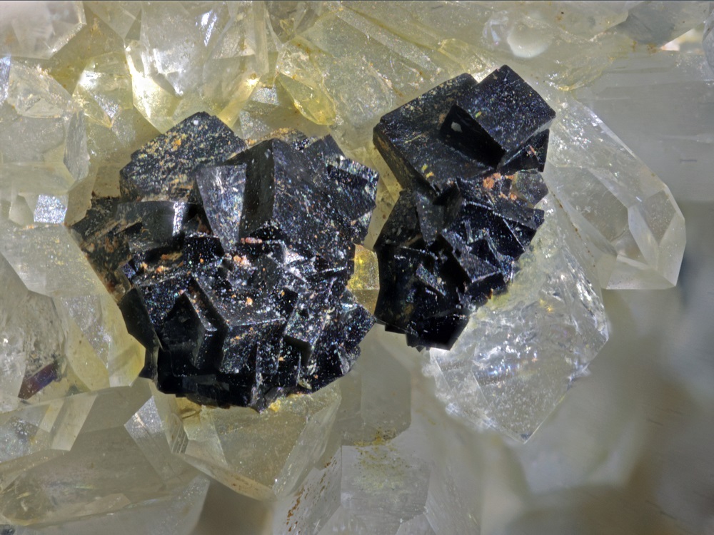 Species: ANATASE Locality: Audley Quarry, Merrimack, NH Specimen Size: 1.0 mm field of view Field Collected: Tom Mortimer Catalog No.: u2410 Notes: An interesting complex anatase crystal group on clear quartz crystals. |