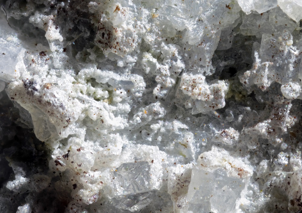Species: OPAL var Hyalite Locality: Audley Quarry, Merrimack, NH Specimen Size: 6 mm field of view. Field Collected: Tom Mortimer Catalog No.: Notes: This opal is not fluorescent. |