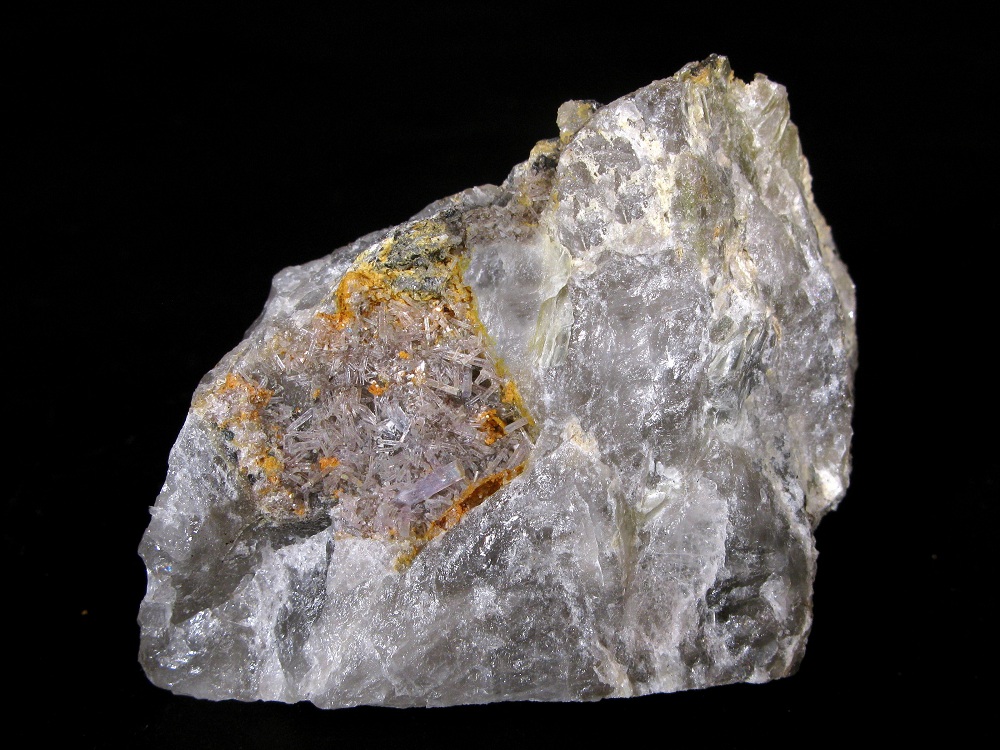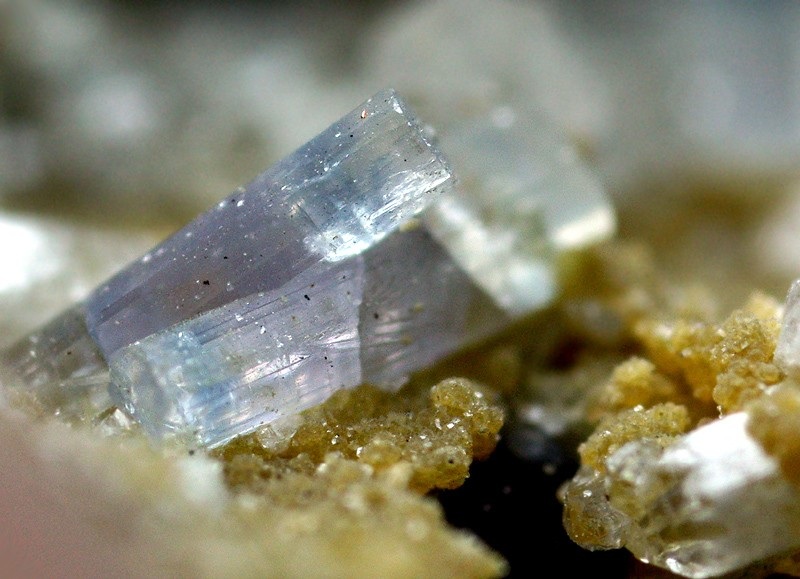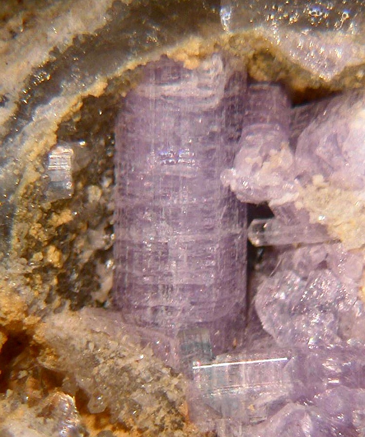 Specimen owner ID's (capitals): TM = Tom Mortimer, BW = Bob Wilken, BJ = Bob Janules, PC = Peter Cristofono, AW = Anna Wilken Photographer ID's (lower case). Identification: WDS analysis of four different Chickering Mine apatites (blue massive, lavender prismatic, milky tabular, and botryoidal) confirmed all were fluorapatite. I [tm] recognize the official Apatite-(CaF) species name has reverted to Fluorapatite. In the alphabetical order sense, most mineral collectors think of "Apatite" first, before refinement to fluorapatite or hydroxylapatite. For this reason the Apatite-(CaF) and Apatite-(CaOH) nomenclature is used here. Discussion: APA_1: This apatite fluoresces orange in SW UV and red in LW UV. APA_4, APA_5: TM, BJ and others collected many specimens of these lavender-colored prismatic apatites from a quartz core zone in the center of the pit during 2004. |