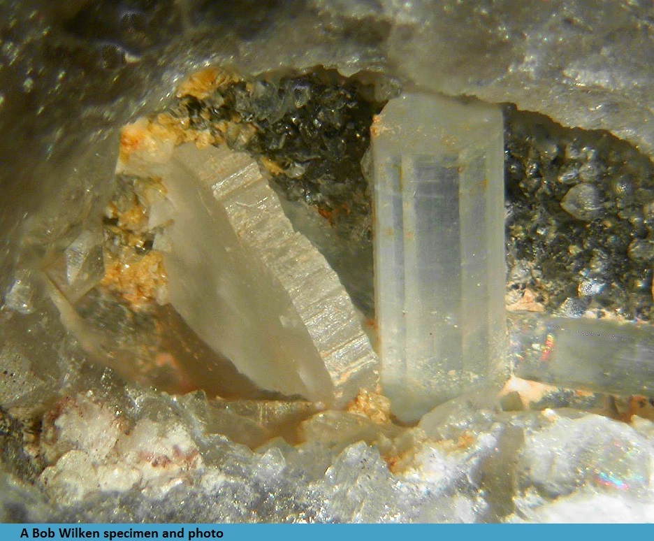 Specimen owner ID's (capitals): TM = Tom Mortimer, BW = Bob Wilken, BJ = Bob Janules, PC = Peter Cristofono, AW = Anna Wilken Photographer ID's (lower case). Identification: BRY_1 => EDS analysis EDS analyst stated "Beryllonite with Mn staining." The EDS detector had minimal Na response. BRY_2, BRY_3 => visual. Discussion: Beryllonite occurs at the Chickering Mine as milky, tabular, “cord-wood stacked” habit, crystals. |