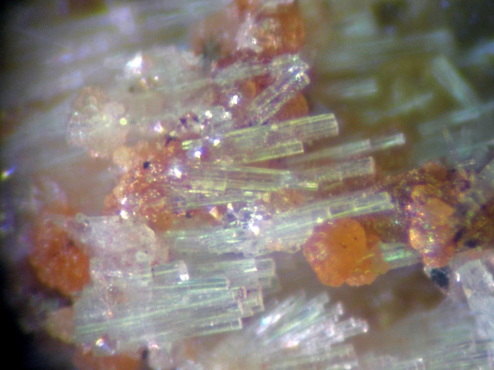 Specimen owner ID's (capitals): TM = Tom Mortimer, BW = Bob Wilken, BJ = Bob Janules, PC = Peter Cristofono, AW = Anna Wilken Photographer ID's (lower case). Identification: Unknown. Tom Mortimer catalog # u1407 Discussion: Most, but not all crystals are flattened prismatic. Very high luster does not make me think of apatite. Wardite and perhaps goyazite are also present on this specimen. [bw] Your UK3 is a very interesting one. Until reading that it was flattened I thought palermoite because of its elongation and striations. I have found some embedded material that looks similarly highly striated, colorless and flattened too. (photo UK_BW2) I initially dismissed it as colorless childrenite. In all the embedded stuff I have, nowhere can I descern terminations. It seems to be intimately associated with embedded wardite too. I'm just wondering if it may be the same stuff. |