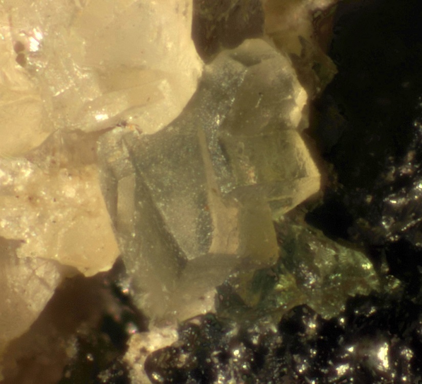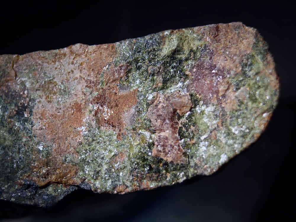 Species: DICKINSONITE Locality: Turner Mine, Marlow, NH Specimen Size: 2.5 cm horizontal view Field Collected: Kevin Czaja Catalog No.: A Kevin Czaja specimen, "12" Notes: Massive green candidate dickinsonite. A low count, noisy, EDS analysis suggested dickinsonite is a good candidate, supported by Mn > Fe and possibility that un-quantified peaks are the required Al. An EDS analysis by Kevin Czaja of this massive green mineral for his Mar/Apr 2025 Rocks & Minerals article on the Turner Mine provided a much improved result. The quantified chemistry from this analysis indicated K1.22Na12.6Ca0.86Fe4.21Mn12.3Al1.4P12O59H2.7 , normalized for 12 P. Mindat.org (2025) reports dickinsonite-(KMnNa) chemistry as: (KNa)(Mn2+[ ])Ca(Na3)Mn2+13Al(PO4)11(PO4)(OH)2 . The Turner Mine sodium content is very high for dickinsonite. A webmineral.com analysis of a dickinsonite has 3.9 APFU of Fe, which is allowed in their formula, but not present in the mindat.org formula.