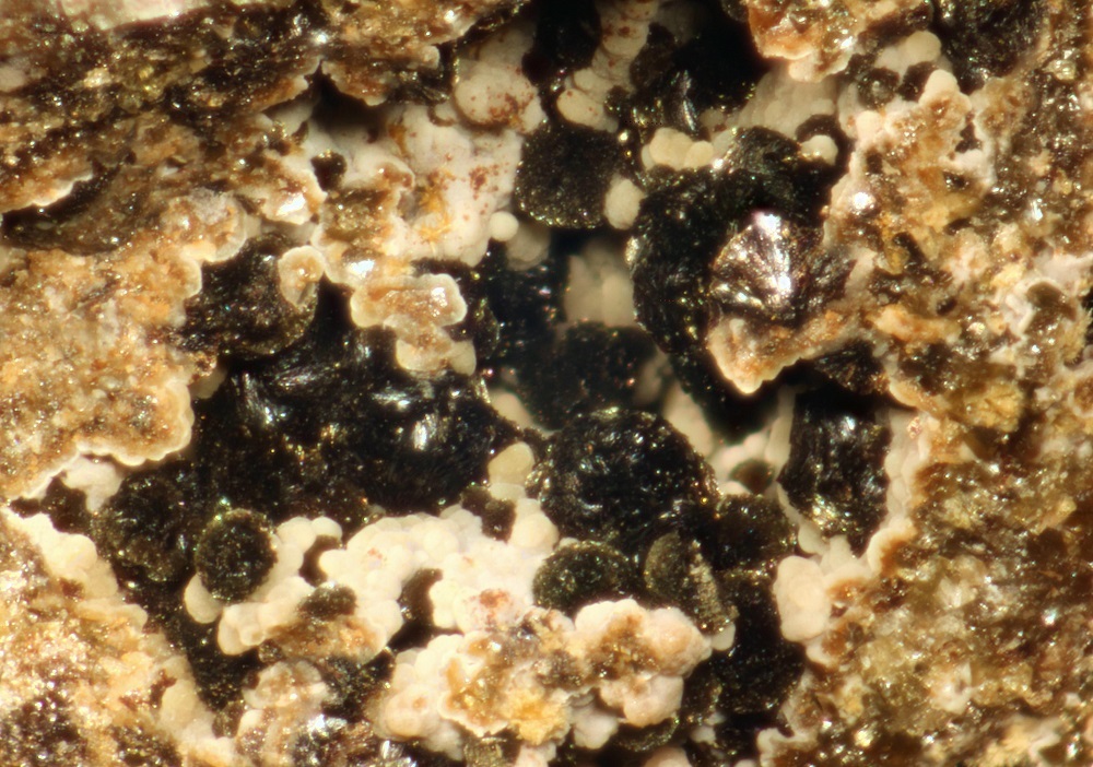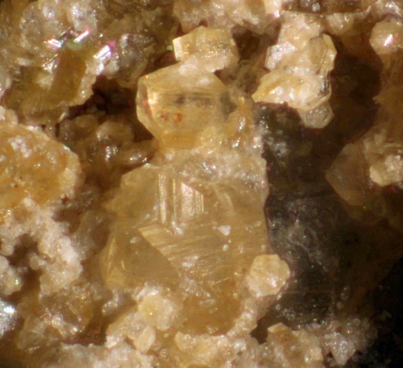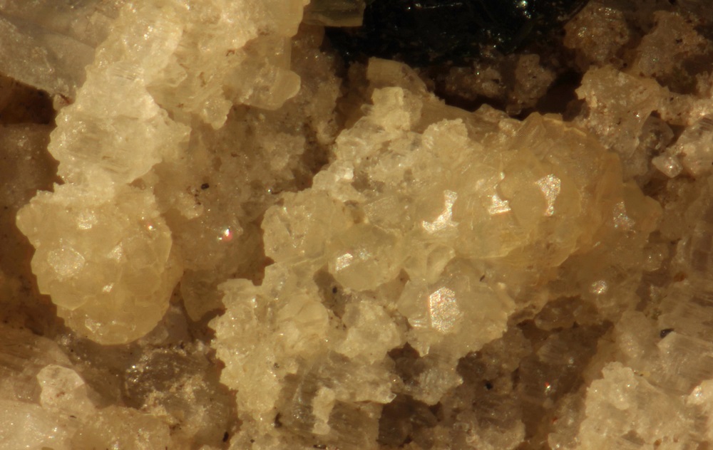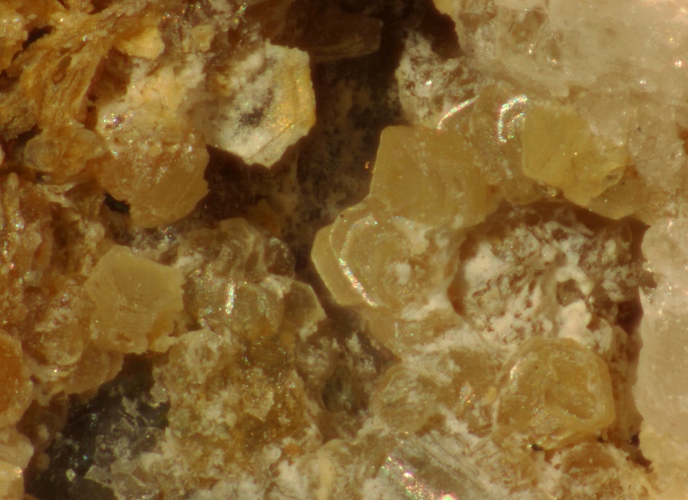Locality: Plume Mine, N. Groton, NH Specimen Size: 5.7 mm fov Gorceixite xl masses. Field Collected: Bob Wilken Catalog No.: A Bob Wilken specimen and photo Notes: