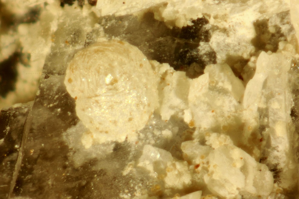 Locality: Plume Mine, N. Groton, NH Specimen Size: 3.0 mm fov. Gorceixite ball. Field Collected: Bob Wilken Catalog No.: A Bob Wilken specimen and photo Notes: