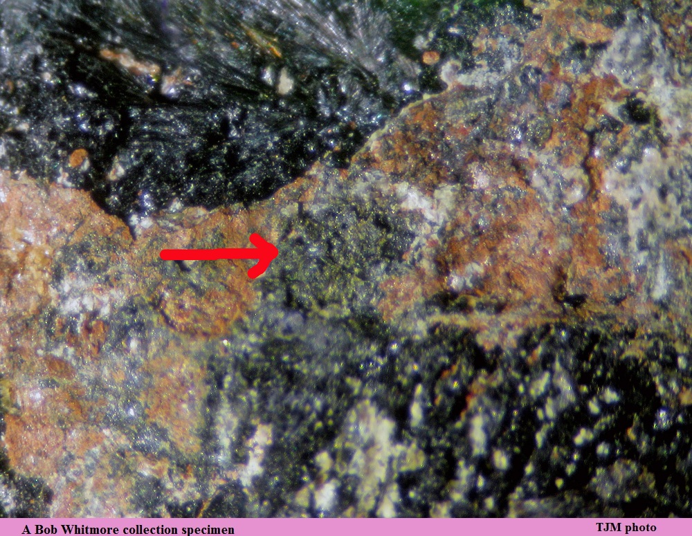 Confidence: 2 (no supporting analysis) Chemistry: Ca0.5Fe2+Fe3+5(PO4)4(OH)6 · 2H2O Locality: Fletcher Mine, N. Groton, NH Specimen Size: 1.5 mm zone @ red arrow of gray-green dufrenite. Field Collected: Bob Whitmore - 1968. Specimen likely sold. Catalog No.: A Bob Whitmore specimen Analysis: None Notes: Basically an iron phosphate with a pinch of calcium. Could be difficult to differentiate from rockbridgeite chemically and visually.