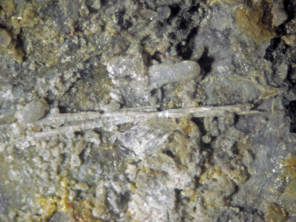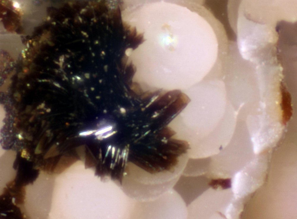 Confidence: 2 Chemistry: CaAl2(PO4)2(OH)2 · H2O Locality: Palermo Mine, N. Groton, NH Specimen Size: 2 mm field of view. White sprays embedded in vivianite. Field Collected: Unknown. Found in a box of "Palermo rough" material Owner: Arnaldo Brunetti - Canada Analysis: The specimen was labeled gatumbaite. An EDS analysis (BC160 - 3/2/17) of one of these white balls (on carbon tape) gave a result for which gatumbaite may be a "best fit" with some Sr and K substituting for some Ca. The analysis suggests a chemistry (normalized for 2 P): Ca0.35K0.07Sr0.17Al3.21(PO4)2(O)11 Notes: Arnaldo sent me this specimen for analysis.