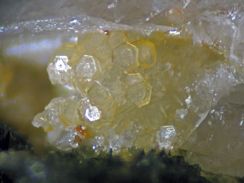 Locality: Plume Mine, N. Groton, NH Specimen Size: 2.4 mm fov of Gorceixite xls. Field Collected: Bob Wilken Catalog No.: A Bob Wilken specimen and photo Notes:
