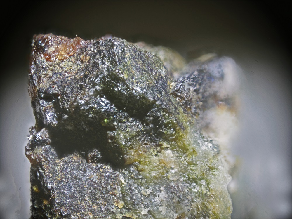 Locality: Turner Mine, Marlow, NH Specimen Size: 5 mm field of view. Field Collected: Kevin Czaja ? Catalog No.: u2787 Notes: [tm] I believe this is a small sample from a Kevin Czaja specimen. The dickinsonite is the dark glassy green area on the upper portion of the sample. Really not much to see here. EDS analyses, BC575, computed a chemistry of: K1.02Na3.34Ca0.92Fe10.04Mn15.34Al0.64P7.23O48 normalized for 48 O. Ideal dickinsonite chemistry (mindat.org) is: (KNa)(Mn2+[ ])Ca(Na3)Mn2+13Al(PO4)11(PO4)(OH)2 . For this Turner dickinsonite, all the expected elements are present, but the Mn+Fe is high. Dickinsonite is a very elusive NH species. Most candidates analyze to be another member of the arrojadite group.
